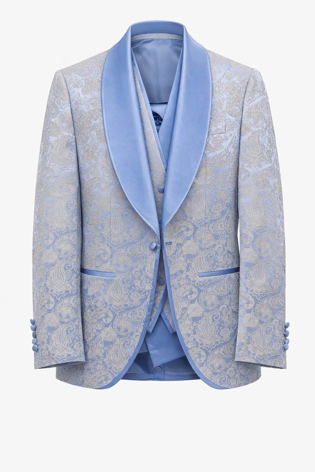 Make an unforgettable entrance with this exquisite sky blue paisley tuxedo. Expertly tailored for elite weddings and gala events, this three-piece set blends traditional Turkish craftsmanship with modern London flair for the ultimate luxury statement.